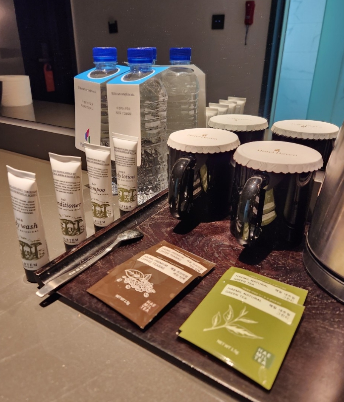 생수와 수건, 샤워용품 등은 따로 부탁 안드려도 매일 문 앞에 놓아주셔서 좋았구요 청소를 원하는 날은 외출시 문 밖 손잡이에 펫말을 걸어두면 되니 불편함이 없었어요 시스템 에어컨에 벽걸이 TV도 큰 편이고 넓은 화장대에 드라이기도 있어서 편했어요 세면대도 높은 편이라서 허리 안아프고 좋았어요 침대 매트리스도 꺼짐없이 탄탄해서 편안했어요 이태리 라텍스침대 같아요