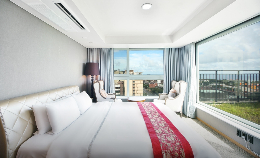 정말 서귀포스러운 호텔이었어요 주차 안내해주는 분들이 매번 계셔서 편했습니다 호텔도 조용하고 여유로웠고 뷰는 기대 안했는데 바다가 꽤나 보이고 아름다웠어요 다시 이용하거나 주변사람들에게 추천해줄 거에요 엘리베이터도 빠르고 가격도 합리적이에요 창문이 크고 환기가 잘되어서 좋았습니다