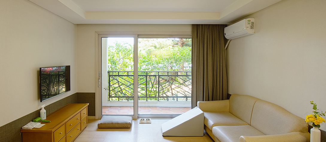 전체적으로 리조트 규모가 커서 숙소인 A동에서 더몰 (부대시설)까지 거리가 있는 편이에요 A동 리조트 취사 타입에 묵었는데 그릇, 컵, 커트러리, 후라이팬, 냄비 등 조리도구 있고 인덕션, 밥솥, 전기포트 있어서 너무 잘 이용했어요 전자레인지는 1층 공용 공간에 있어요 테라스가 있어서 뷰도 좋았고 내부도 깔끔했어요