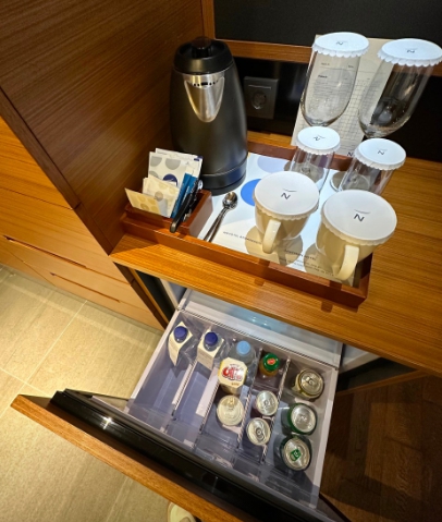 14층에서 묵었는데요 엘베부터 복도 숙소까지 깔끔했습니다. 숙소에 구비된 건 물 2병 샤워캡 비누 드라이기 각종 잔들