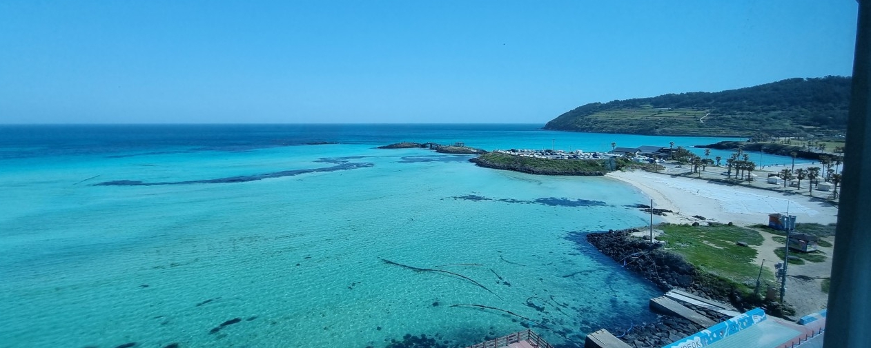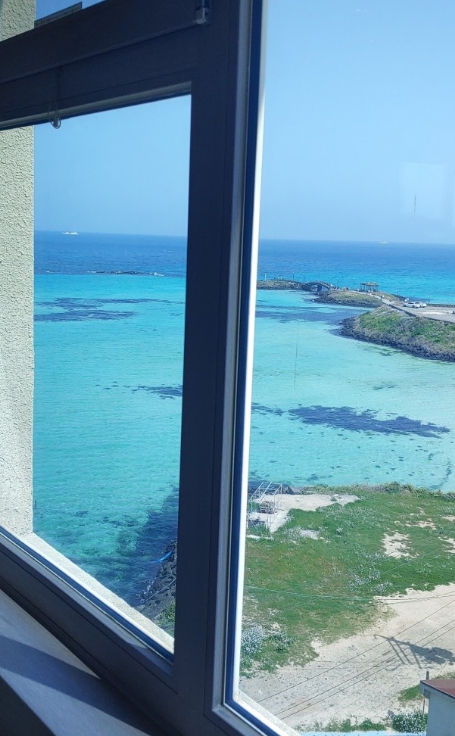 그리고 카펫이 더럽다는 리뷰가 있는데 객실바이객실인지 제가 받은 방은 괜찮았습니다. 오히려 카펫이 깔려있어 부드러운 분위기가 퍽 마음에 들었어요♥ 사진은 보정 1도 안한 함덕해수욕장인데, 실물이 더 예뻐요... 에메랄드빛 진짜 최고입니다...