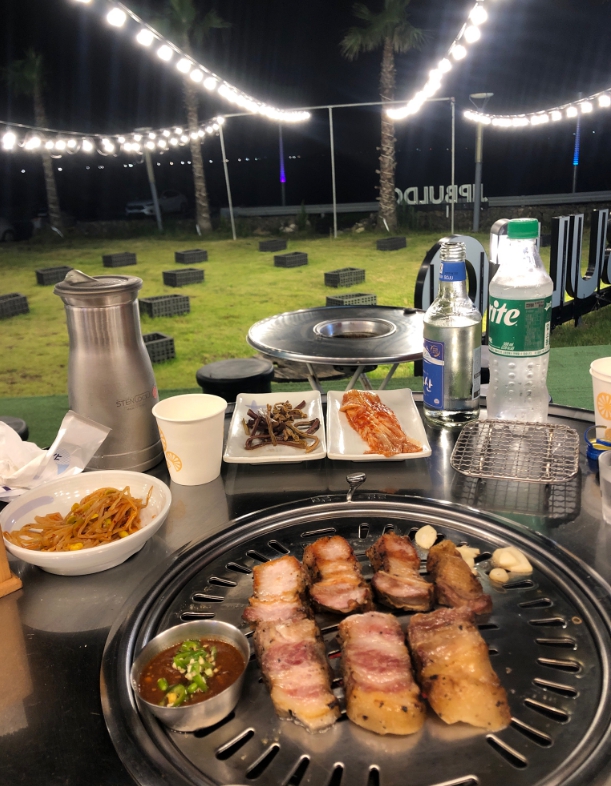 제주도 여행 두번째 날은 서쪽에 위치한 애월 협재로, 숙소는 한경면 판포리에 위치한 메가리조트로 정했습니다. 왜냐하면 장민호,정동원이 다녀간 "바다를 본 돼지"에서 즐거운 저녁식사를 하기 위함이죠. 아름다운 서쪽 바다를 바라보며 먹은 흑돼지구이는 정말 최고였습니다. 일부러 메가리조트로 예약했는데 정말 잘한 거 같아요. 앞에 정원도 예쁘고 만족스러웠습니다.