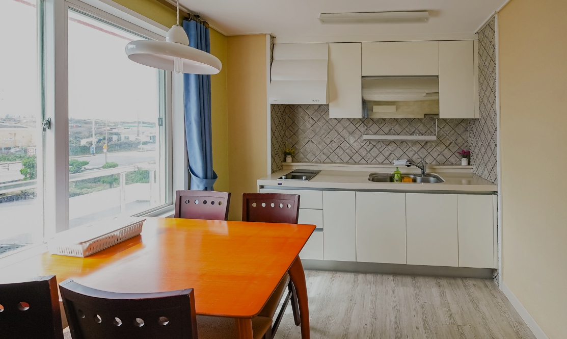 결항으로 인해 갑자기 숙소를 알아보는데 바다가 보이는 저렴한 가성비 좋은 곳을 찾다가 발견한 곳이예요. 공항에서는 50분정도 걸리는 거리라 좀 부담스러웠지만 보너스 같은 하루를 바다 볼 수 있는 곳이라 베스트 선택이였어요. 17평형이라 부엌 겸 거실 넓게 사용할 수 있었고 다만 화장실이 좁은 게 흠이라면 흠이예요.