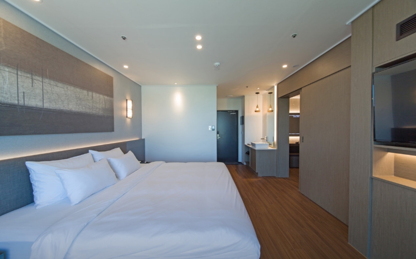외관이 깔끔해서 좋아보였고 체크인 시 직원 여성분의 친절한 응대도 좋았고요 바로 해수욕장 앞이네요 앞에 건물만 없었으면 뷰가 너무 좋았을텐데 좀 아쉽긴 해요. 스위트 스파로 예약하고 갔는데, 평일이라 그런지 업그레이드 해주셨어요. 넓은 방에서 잘 쉬다 왔습니다. 뷰는 기대 안 했는데 바다도 측면으로 보이고 밤 되면 다리에 불이 들어와서 예뻤어요.