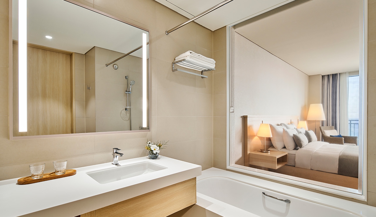 제가 묵은 방은 그랜드 디럭스 더블룸 침대 앞에 쇼파와 테이블이 있어서 음식을 먹으며 티비보기 좋은 구성 입니다. 방은 생각보다 너무 넓었고 욕실도 거대 합니다. 다만 방 크기 대비 냉방은 중앙제어의 한계를 여실히 보여주네요. 한낮엔 26도 아래로 안내려가고 저녁 늦게 되서야 23도까지 내려갑니다. 열이 많은 사람에게는 단점이 됩니다 욕조 블라인드를 올리면 반신욕하면서 바다와 tv도 볼 수 있어요. 침대도 폭신하고 크리닝 상태도 만족스러웠습니다. 테라스도 방크기와 같이 거대하게 넓네요 밤에 비가 내렸지만 아침엔 날이 개고 화창한 속초해변 뷰