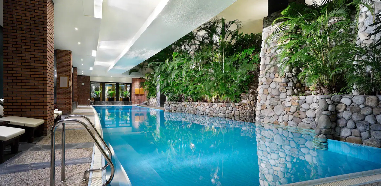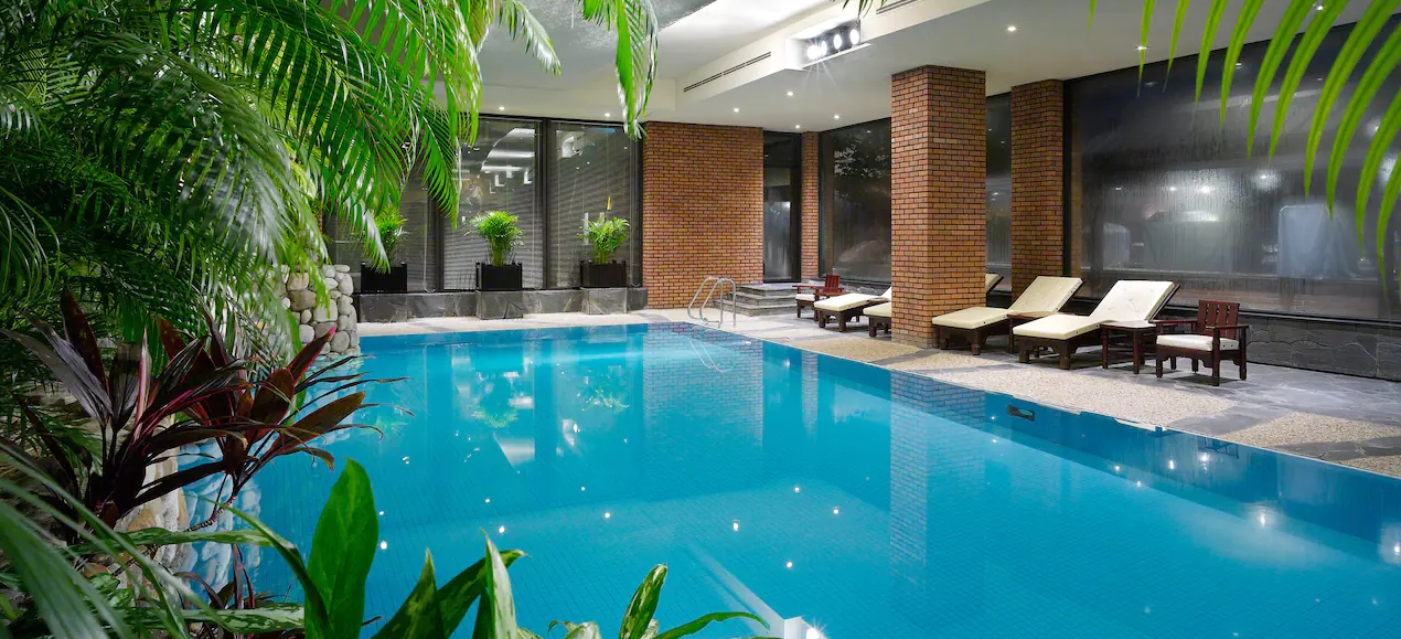 실내수영장임에도 통창과 천장이 있어 외부로부터 햇살이 짱짱하게 들어옵니다. 그리고 식물을 많이 비치해서 실외수영장 같은 느낌이네요. 야간에는 조명을 은은하게 해놔서 분위기 있습니다. 실내수영장 옆에 문을 열고 나가면 바로 야외수영장이 있는데 사우나를 이용하지 않는 경우 수영장에서 옷을 갈아입거나 씻는게 안되고 객실에서 수영복 착용 후 가운입고 내려가서 수영장 이용 후 다시 가운입고 객실에 와서 씻어야합니다.
