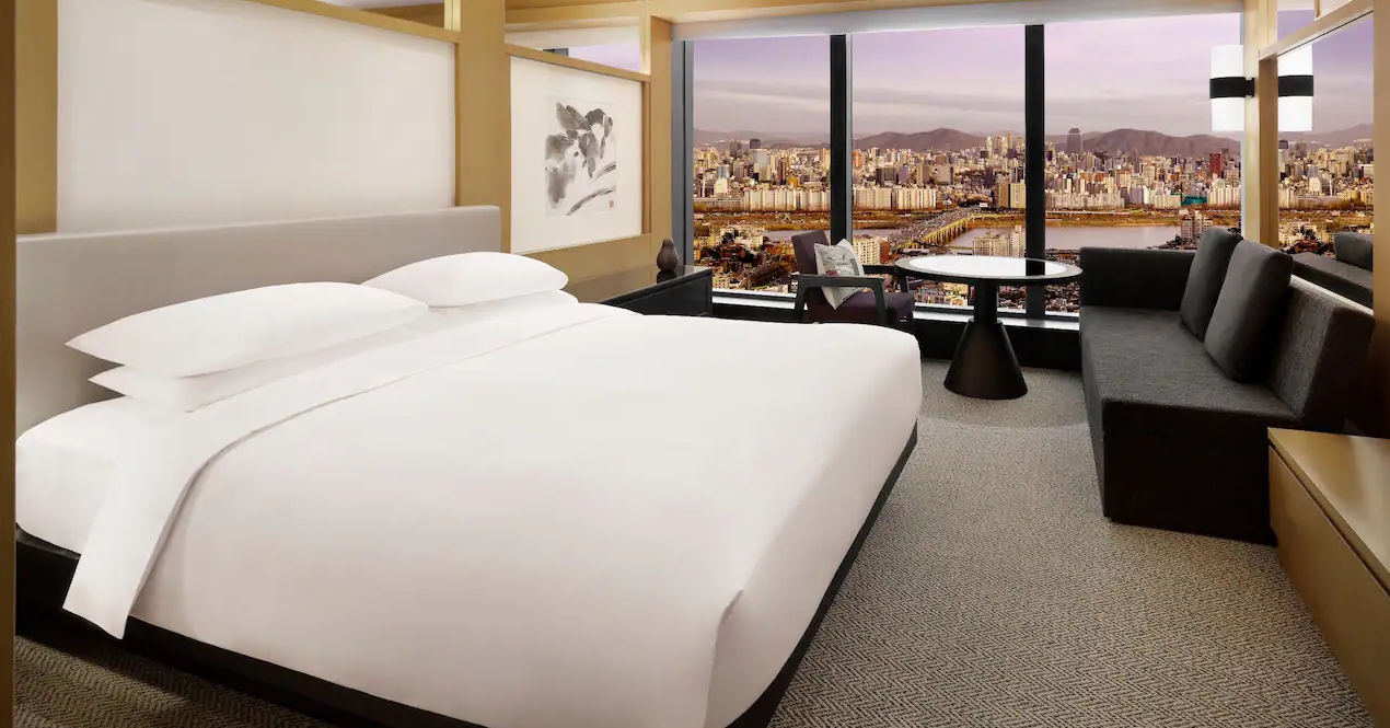 체크인을 늦게 한편이라 7층 배정받았고 프리미어 전망룸이 아니라 뷰가 안좋을까봐 걱정했는데 하얏트의 전 객실이 남산뷰 또는 한강뷰이니 스탠다드여도 충분히 괜찮은 것 같아요 저는 둘 중 남산뷰를 선택했어요 방 문을 연 순간 눈앞에 통창뷰가 쫘악 펼쳐집니다. 뷰만 보고 있어도 좋았어요. 한쪽 벽면에 거울이 있어 방 크기에 비해 시야가 더 많이 확 트인 느낌입니다. 7층이어도 부지가 높다보니 전망이 충분히 좋았습니다. 날씨가 조금 흐렸음에도 뷰가 너무 좋았어요.