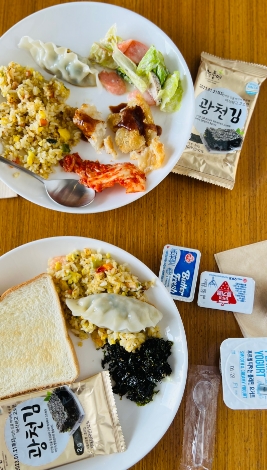 후기 사진보고 빵이나 스크렘블정도 나오는줄 알았는데 완전 한식으로 밥,볶음밥, 순두부찌개,반찬,고추장불고기,각종 반찬들, 과일 종류별(싱싱), 식빵,크로와상,베이글 등 , 원두커피(스타벅스원두)-얼음도 있음, 우유,주스 + 컵라면도 제공