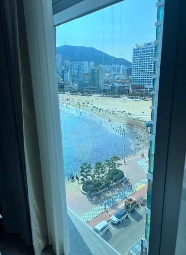 씨티뷰 객실이었는데 통창으로 오션뷰가 보였어요. 해변가로 하프오션뷰였고 통창이라 탁 트인 느낌이 너무 좋았습니다.
