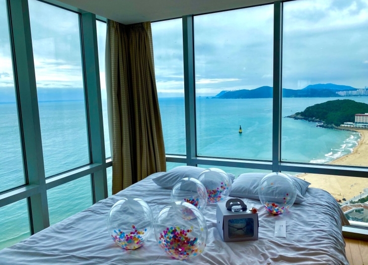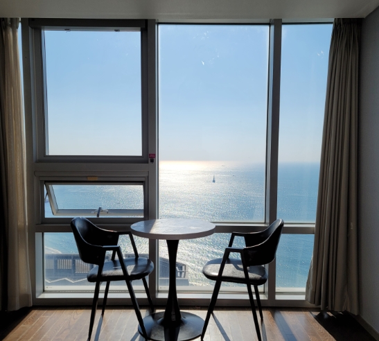 오션뷰여서 바다가 잘보이고 침대에 누워서도 보이기 때문에 해운대 앞바다에서 이만한 가성비의 호텔은 없을 것 같아요
